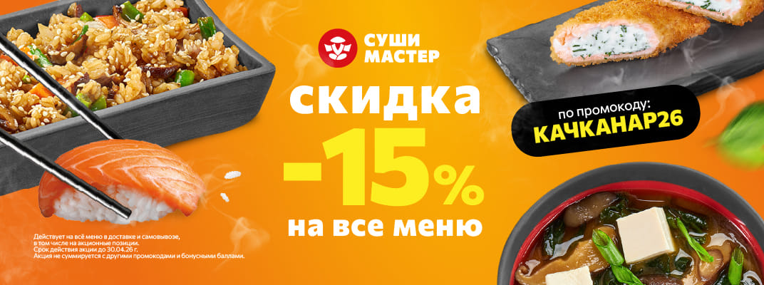 Суши Мастер дарит скидку 15% на все блюда из меню ;)Промокод: КАЧКАНАР26 (используй его в момент оформления заказа)